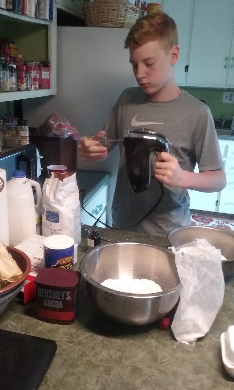 This is Briggs a few nights ago. Out of the blue he wanted to bake a cake. We had a box of cake flour around with three possible recipes on the back. He chose one and charged in. The result was dandy.
